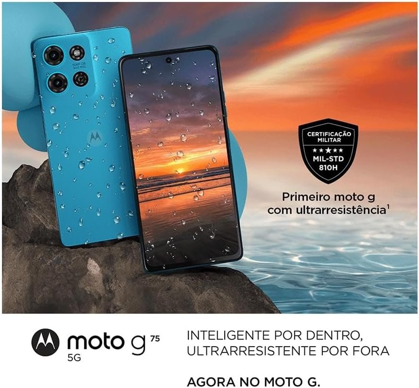 Primeiro Moto G com ultrarresistência militar MIL STD 810H: O novo Celular Motorola Moto g75 5G passou por 16 testes rigorosos de durabilidade no padrão do Departamento de Defesa dos EUA e resiste a diversas condições ambientais extremas. Preparado para altas temperaturas Até 70°C por 4 horas em ambientes úmidos; Até 60°C por 4 horas em ambientes secos e Radiação solar de até 49 ºC por 24 horas. Preparado para baixas temperaturas – Até -20ºC por 5 horas. Protegido contra variações bruscas de temperatura Suporta variações térmicas de -21ºC a +50ºC frio-quente; Suporta múltiplas variações de -10ºC para +25ºC frio-quente e quente-frio. Ultrarresistência a chuva, umidade e maresia; Exposição à chuva por 90 minutos (exclusivo certificação); Imersão em água 1,5m por até 30 minutos (igual IP68); Umidade do ar em até 95% com temperatura de 30º C a 60º C por 10 dias (exclusivo certificação); Alta salinidade por até 4 dias. Performance nas alturas do Celular Motorola Moto g75 : Funciona até 4,5km de altura por 1 hora. O poder da IA e a câmera Sony – LYTIA 600: Não precisa ficar procurando a luz ideal para fazer aquela foto perfeita. O sistema de câmera de 50 MP usa o sensor Sony – LYTIA 600, que tem um desempenho incrível para fotos e vídeos em qualquer iluminação. A foto perfeita em um só clique: Capture todos os detalhes com os novos recursos da nossa inteligência artificial, que entrega fotos incríveis, com um só clique e em qualquer luz. Fotos no escuro 15x mais rápidas: O modo Night Vision avançado funciona em ambientes com pouquíssima luz para revelar mais detalhes no escuro. Toda essa tecnologia utilizando captura em RAW, que captura fotos 15x mais rápidas. 5 anos de atualização de Android: Seu moto g75 5G melhora com o passar do tempo. Com cinco upgrades do sistema operacional Android™, você tem mais desempenho, segurança e estabilidade ano após ano. E as atualizações de segurança até 2029 preparam seu telefone para o futuro. Tela inteligente com superbrilho: Assista a filmes, séries e muito mais sem perder nenhum detalhe na tela Full HD+ de 6,8” com superbrilho. Além disso, a tela possui inteligência artificial que otimiza o consumo de bateria conforme o conteúdo em exibição. 1000 nits com Tamanho de 6,8” e 120 Hz de Taxa de atualização, resolução Full HD+ e proteção Corning Gorilla Glass 5. *Exclusivo Motorola: Imagens vibrantes com Color Boost: O Color Boost ajusta as cores da tela de acordo com a iluminação do ambiente, melhorando a visibilidade da tela e a qualidade das cores. As áreas escuras se tornam mais claras, enquanto as cores ficam mais vibrantes. Está com a mão molhada e precisa usar o telefone? Não se preocupe: Com a tecnologia Smart Water Touch³, a tela do celular responde ao toque ou gesto de deslizar mesmo molhada. Assim, você não passa perrengue enquanto cuida da playlist da festa na piscina ou chama uma corrida de aplicativo na chuva. Inteligência que turbina a performance: O novo Celular Motorola Moto g75 5G é o primeiro smartphone com o processador Qualcomm Snapdragon 6 Gen 3. Com até 16 GB de RAM Boost Inteligente, você experimenta um desempenho excepcional que oferece um verdadeiro turbo para seus aplicativos favoritos. Memória RAM: 16 GB RAM Boost Inteligente Armazenamento: 256 GB Até 36 horas de duração da bateria: Com a superbateria de 5000 mAh desse celular, você pode ouvir música por mais tempo, passar horas e horas em videochamadas com os amigos e maratonar suas séries preferidas até o último episódio.